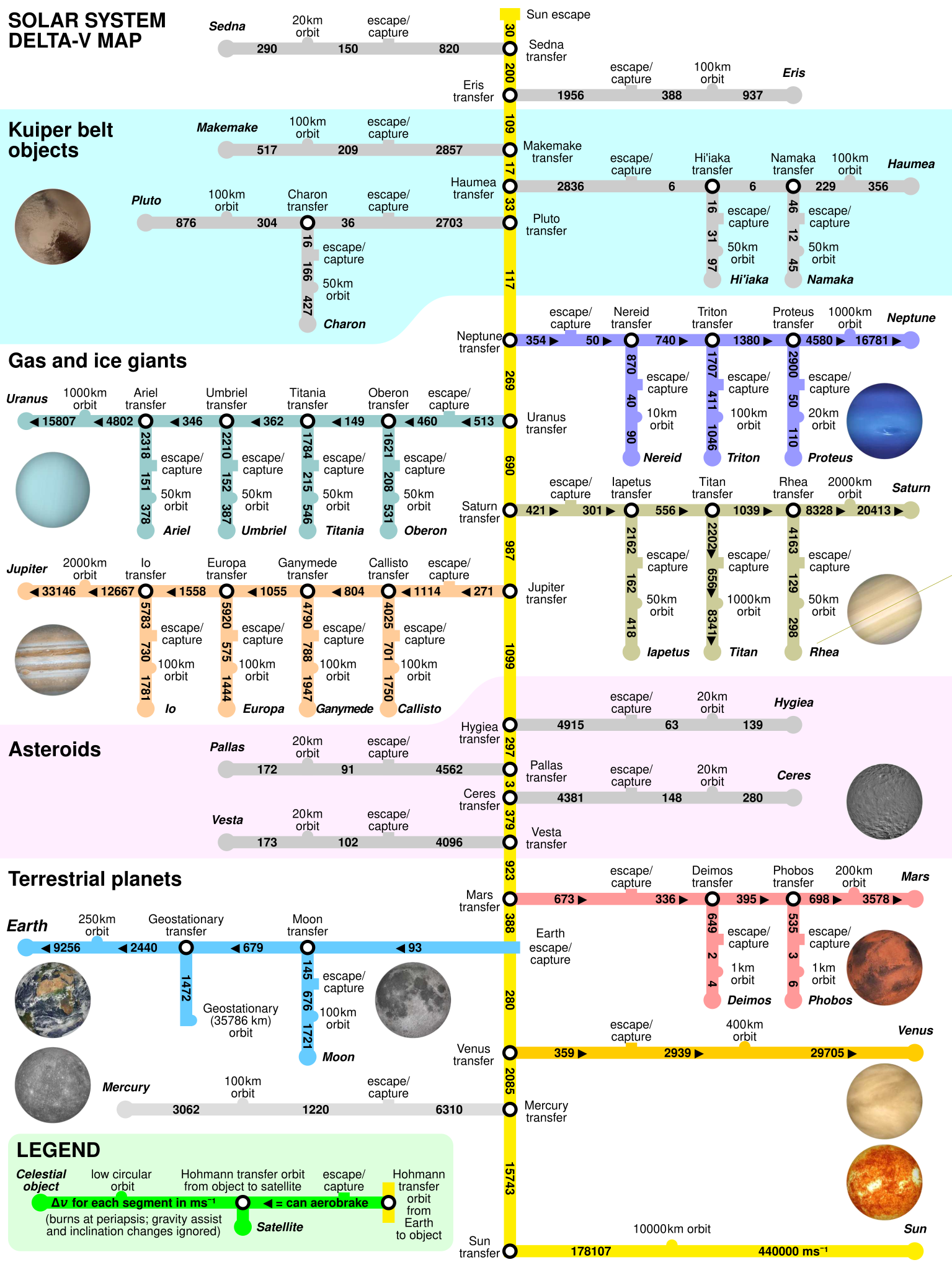 2. Delta-v is a measure of the total manoeuvres a spacecraft can execute. It is measured in change of velocity, usually metres per second, and represents the spacecraft’s available thrust, from which its mass (including that of the fuel needed to generate the thrust) is subtracted. Delta-v is used to judge, for example, how much of its thrust budget a spacecraft needs to reach orbit and how much manoeuvrability it has left for other things after doing so. Therefore, delta-v can be used to calculate how powerful an engine has to be in relation to the fuel and payload aboard to get a craft into Earth orbit and then, for example, on a trajectory for the Moon, for a landing, subsequent take-off and then the return trip back to Earth. This can be calculated for all target objects in the solar system. Delta-v values change in atmosphere as opposed to space, as the atmospheric drag is another force that has to be counteracted and thus also be subtracted from the spacecraft’s potential. ↩︎