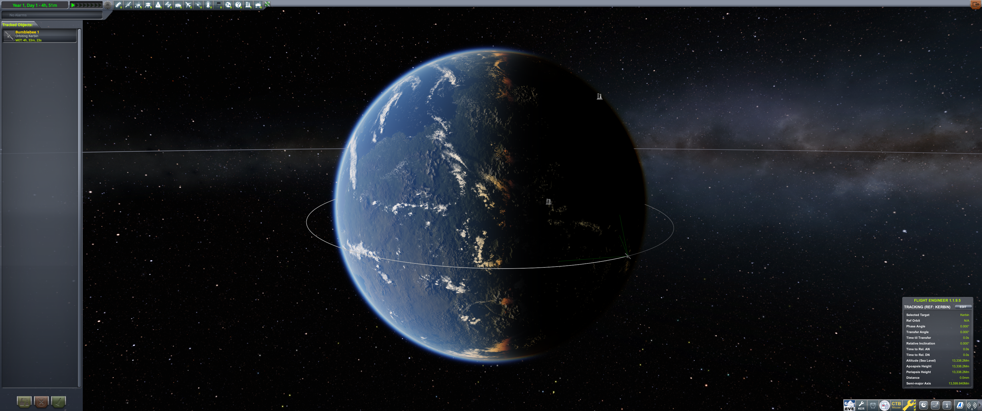 Finally, I extended the satellite’s antennas to complete the mission. Bumblebee 1 had reached a stable orbit around Kerbin.