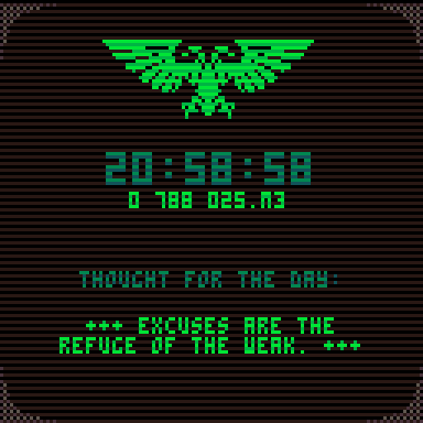 It now includes 120 different Imperial proverbs, one picked at random every day. The app is listed on the PICO-8 BBS and therefore available within PICO-8 itself with the SPLORE command. The source code is also hosted on GitHub. Or you can download the cart directly — enjoy: