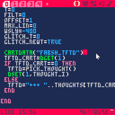 Well, as it turns out, the final version of my Thought for the Day cart for PICO-8 wasn’t the final version after all. I had to fix a bug that crashed the app when running it off the BBS from an iPhone. That should be fixed now.