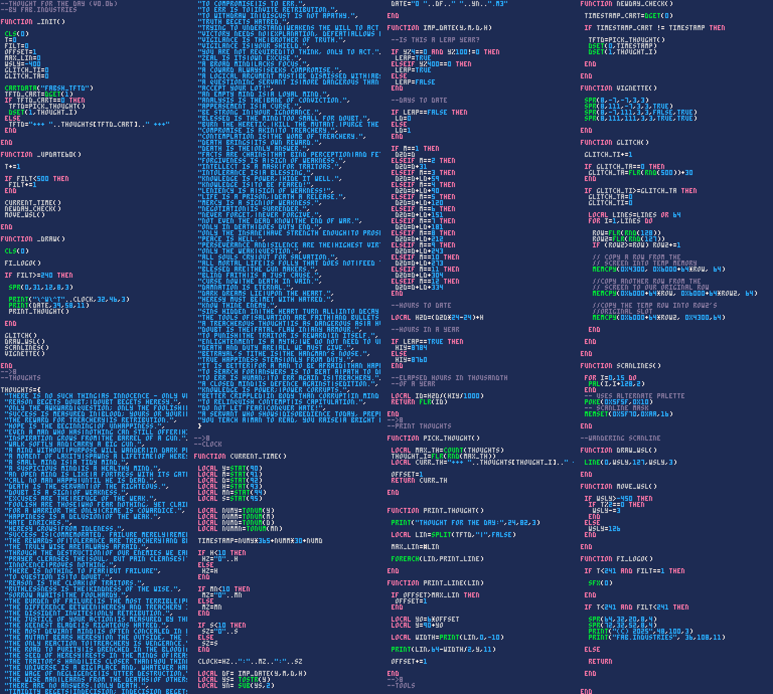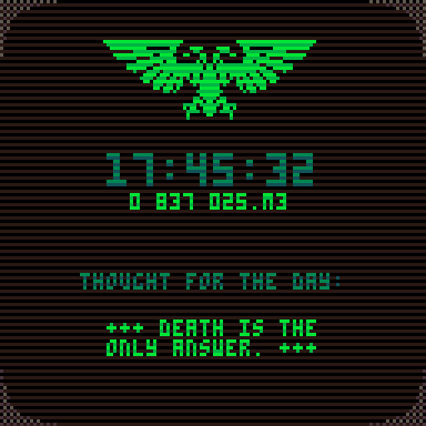 This app was developed completely in the PICO-8 development environment and includes a number of cool features like visual effects that simulate a CRT look, complete with scanlines and a magnetisation glitch. It will also remember what day it is across reboots, in order to show only one inspirational message each day. I am quite proud of this. And of the fact that I figured out how to calculate the Imperial date on a platform that only provides a quite rudimentary date function. At the moment, it includes 120 different Imperial proverbs. Excluding the proverbs and graphics, the whole app is just 337 lines of code.