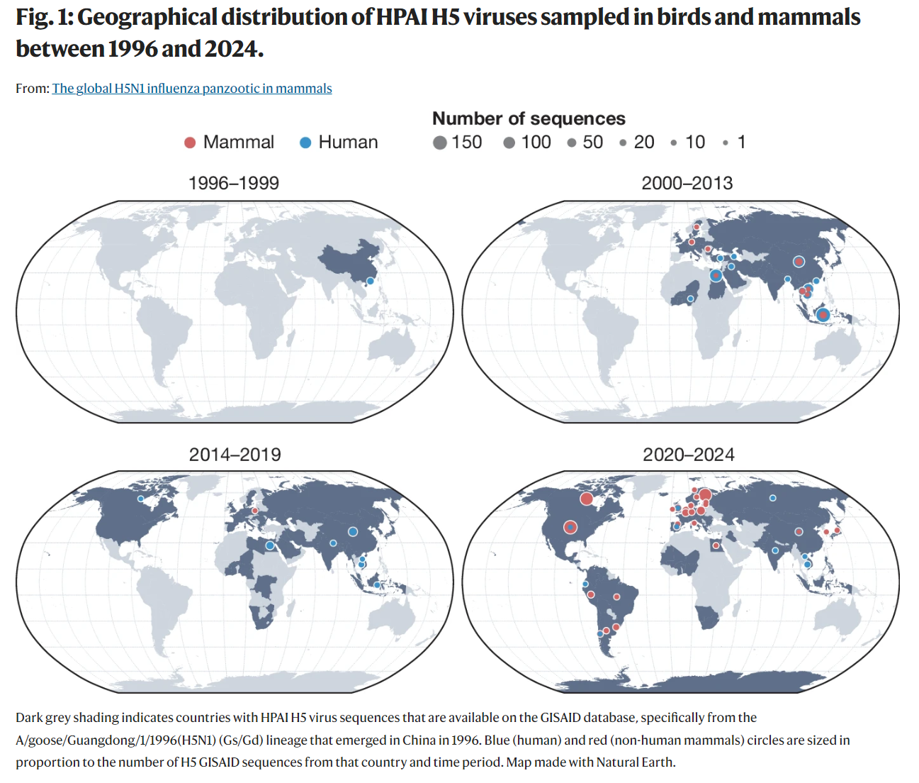 Spread of H5N1 avian flu across the globe from 1996 to 2024 (Peacock et al.)