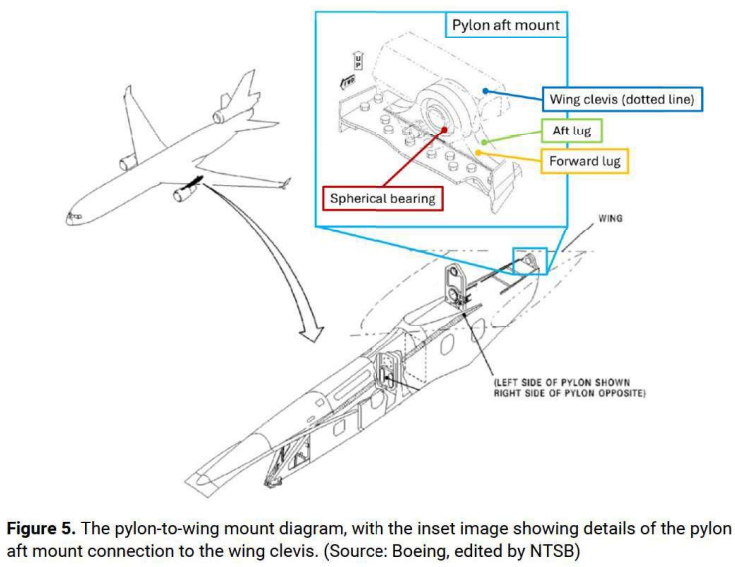 Quoting from the NTSB preliminary report about the failure of the number one engine pylon mount. The left number one and right number three engines of the MD-11 airplane are attached to the underside of pylons that are in turn attached to the underside of each wing. The left and right pylon attaches to their respective wing via forward mount bulkhead, a thrust link assembly and an aft mount bulkhead. For simplification, this report will refer to these bulkheads as the forward mount and the aft mount.