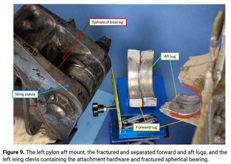 A clevis on the underside of each wing, called the wing clevis, connects to the pylon aft mount via attachment hardware. The left pylon aft mounts forward and aft lugs were both found fractured near their 2 o’clock inboard fracture and 9 o’clock outboard fracture positions when in the aft looking forward frame of reference.
