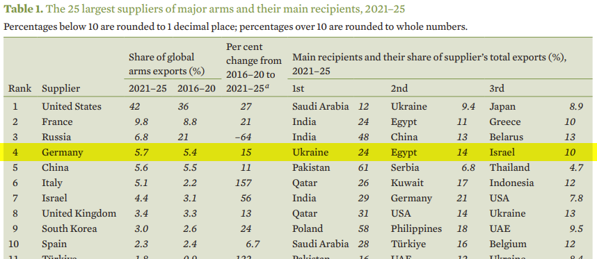 According to the latest report on international arms transfers by the Stockholm International Peace Research Institute, Germany has overtaken China last year to become the world’s fourth biggest weapons dealer. German arms exports in 2021 - 2025 are up 15% from the 2016 - 2020 period and the country is poised to overtake Russia to claim the third place behind the US and France. 24% of German weapons exports go to Ukraine, 14% to Egypt and 10% to Israel.