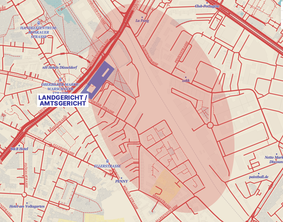 Suchradius des Polizeihubschraubers in rot, Land- und Amtsgericht in blau (eigene Grafik, Karte: Mapbox)